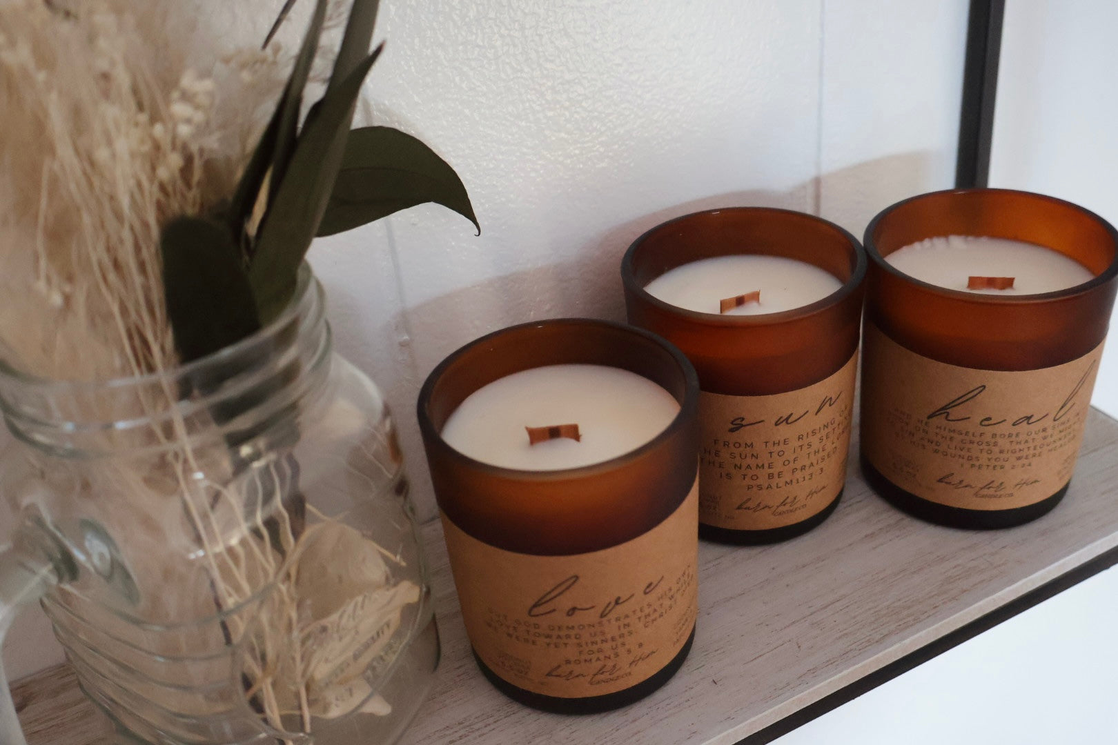 Candles are hand poured with 100% organic coconut soy blend wax and made with wood wicks, creating a slow and steady burn. All fragrances are phthalate and paraben free, made with natural ingredients, and essential oils.